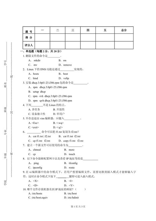 《Linux内核及驱动开发》2022-2023学年第一学期期终试题院(系)_______班级_______学号_______姓名_______题号一二三四总分得分批改人一、单选题(本大题共20个小题,每小题1分,共20分.在每小题给出的四个选项中,只有一项是符合题目要求的.)1、Linux系统的文件系统权限可以通过ACL(访问控制列表)进行更精细的控制。假如要为一个文件设置特定用户的额外权限,应当使用那个命令?()A.setfacl-mu:username:permissionsfilenameB.chacl-uusername:permissionsfilenameC.modifyacl-userusername:permissionsfilenameD.setaccess-userusername:permissionsfilename2、在Linux服务器上,您想要对系统的c盘进行性能测试,包括读写速率、IO等待时间等。以下那个工具可以满足这一需求?()A.hdparm工具B.iozone工具C.dd命令D.以上均可3、在一个企业的Linux布署中,须要实现软件的手动化布署和更新,以提升效率和降低人为错误。可以考虑使用配置管理工具(如Ansible、Puppet、Chef等)来编撰脚本和定义规则。同时,还须要考虑怎样处理软件依赖关系、环境变量设置和配置文件的更新。4、在Linux中,管理员想要限制某个用户对特定目录的c盘使用空间,以下哪种方式可以实现?()A.使用quota命令配置c盘配额B.更改目录的权限,严禁该用户写入C.使用