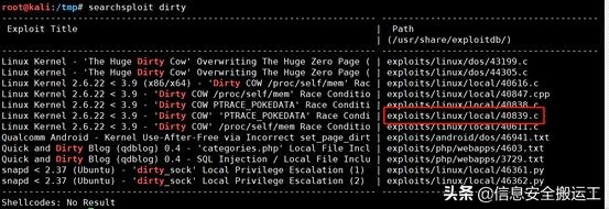 2.使用searchsploit搜索dirty,使用40839.c,将漏洞借助代码上传到目标机器。